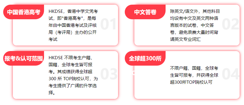 DSE英文科DSE英文科合格是港录取的硬门槛,综合难度较高,要求考生对于词汇量的掌握需要远超内地高考。考试结构分为阅读、写作、聆听及综合、口语四卷,总时长约6小时。其中,聆听及综合被普遍认为较难(尤其是录音只播放一次且题型复杂),其次是口语(需广泛知识储备和临场反应),写作和阅读相对可控。